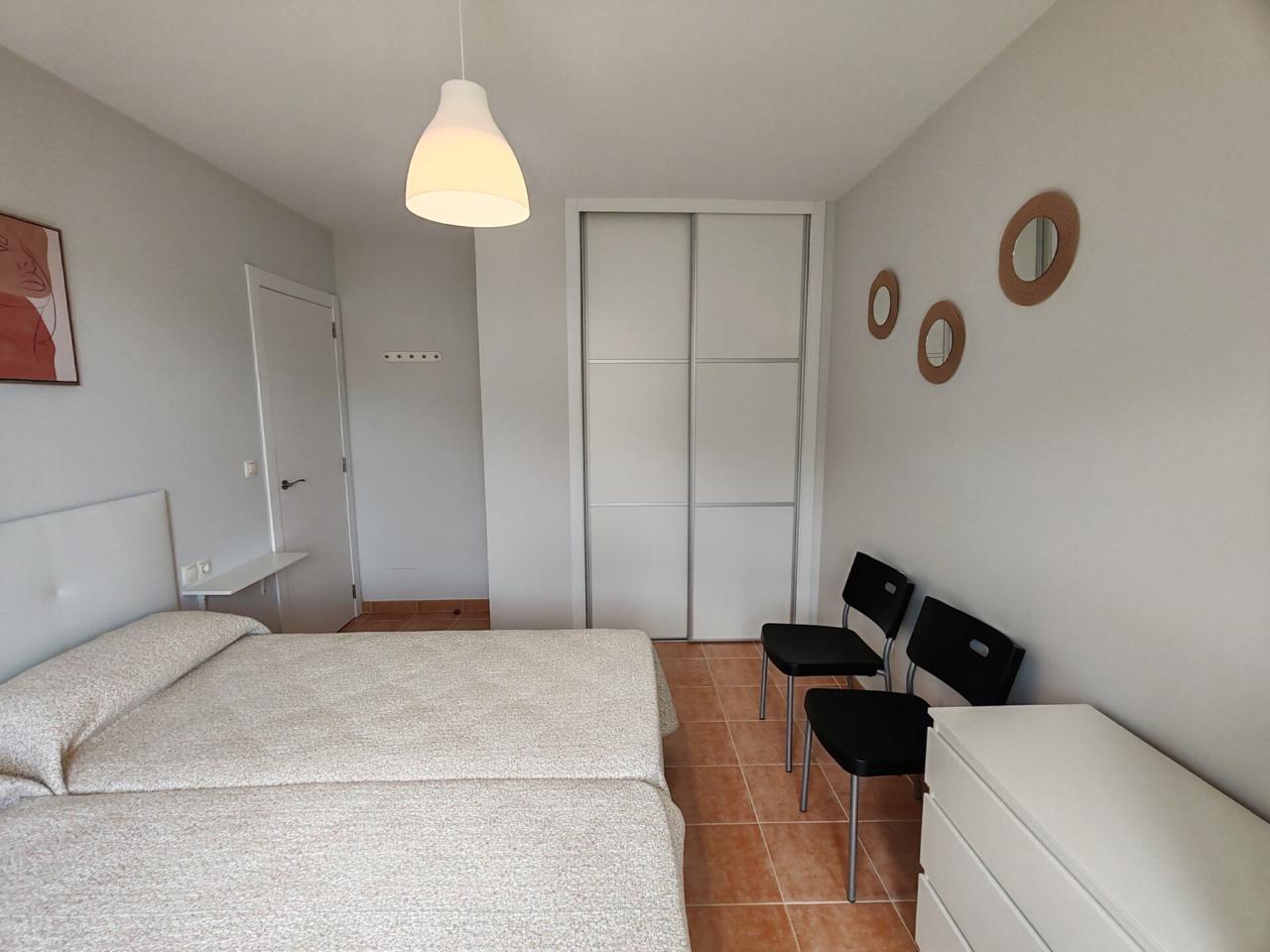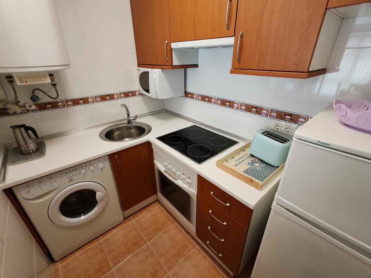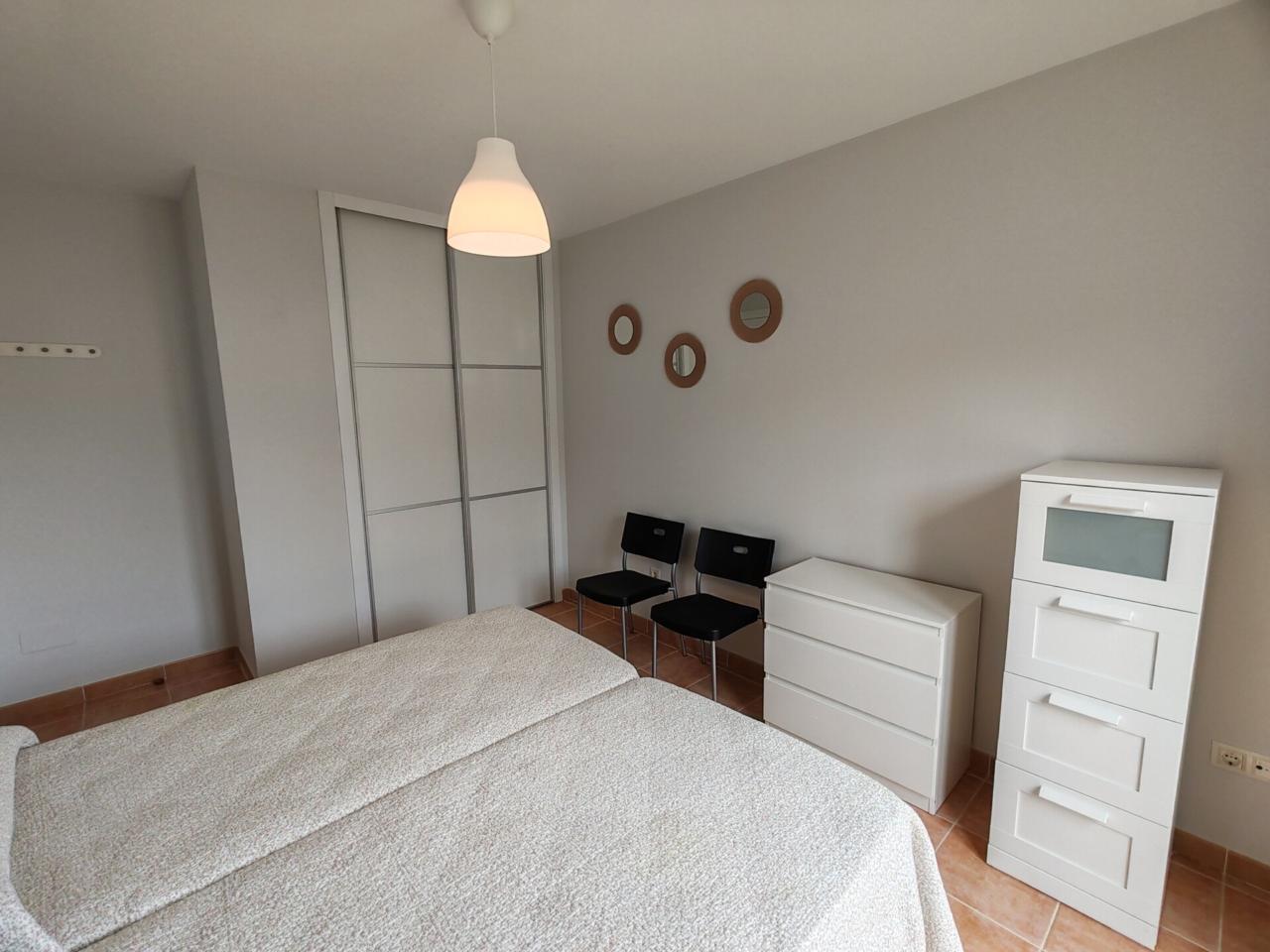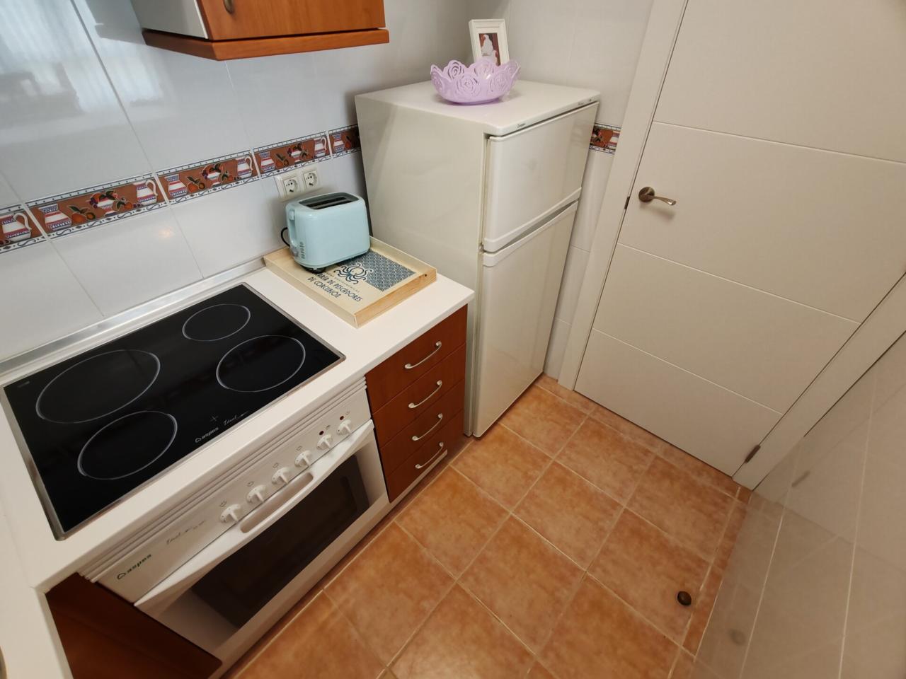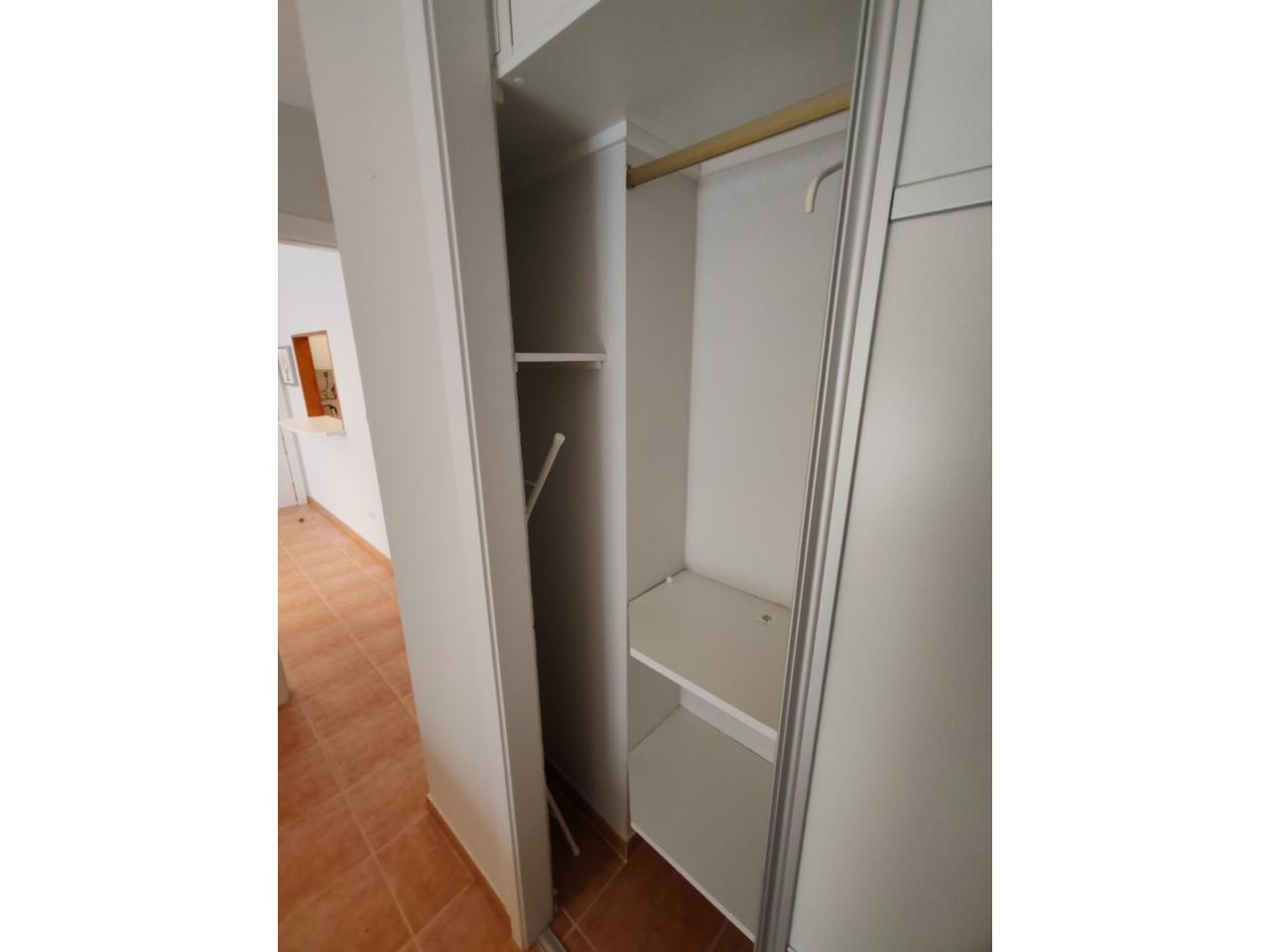 Consta de: dormitorio muy espacioso con un gran armario empotrado, baño completo con bañera, cocina totalmente equipada (frigorífico, lavadora, horno, vitrocerámica, etc) y salón comedor completamente equipado. Justo al lado de la cocina hay un amplio armario empotrado que hace las veces de despensa. Además dispone de plaza de garaje.