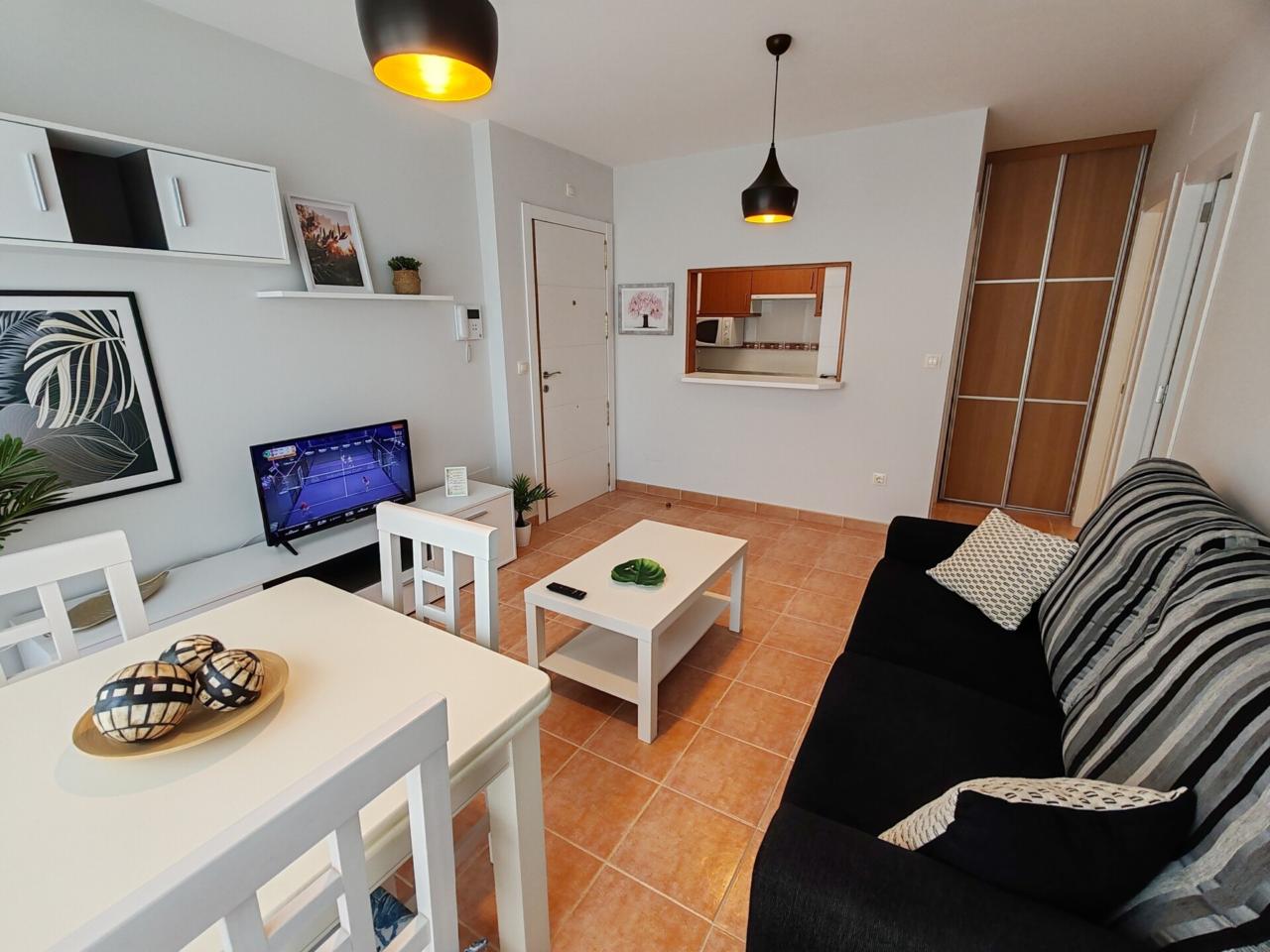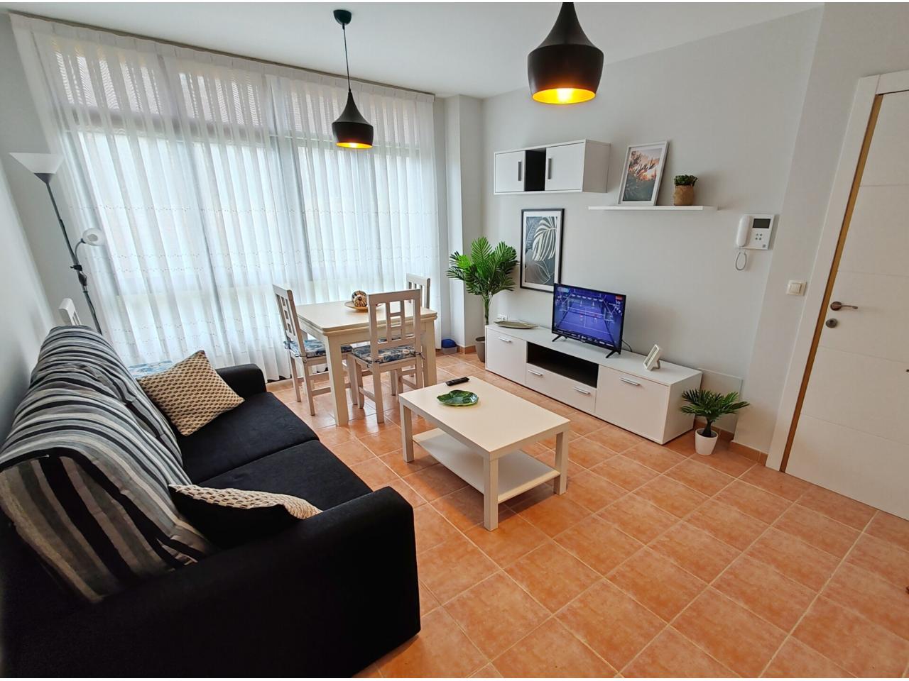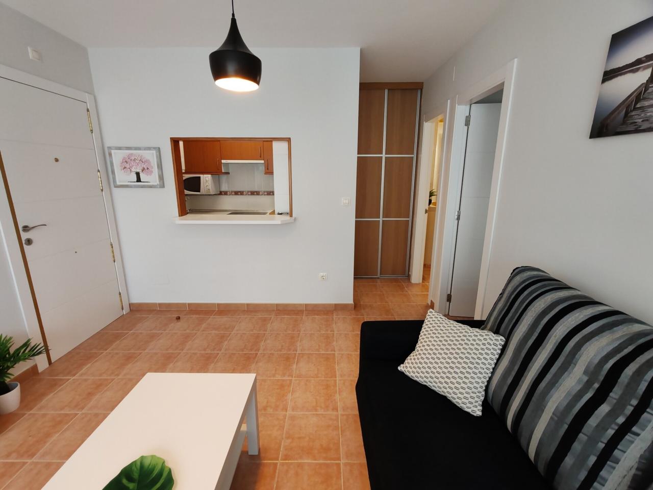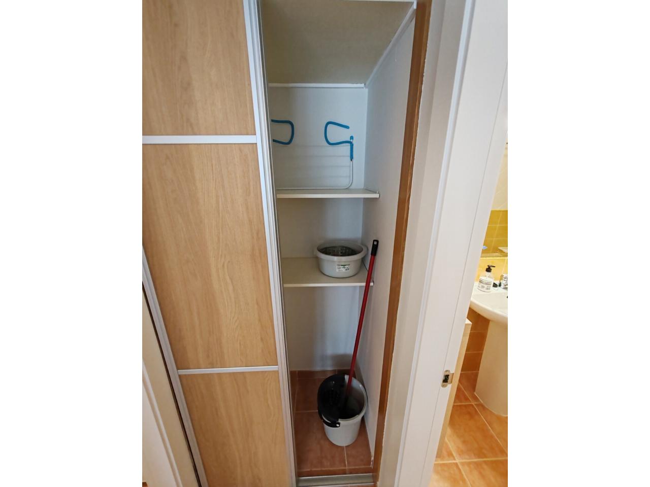 Consta de: dormitorio muy espacioso con un gran armario empotrado, baño completo con bañera, cocina totalmente equipada (frigorífico, lavadora, horno, vitrocerámica, etc) y salón comedor completamente equipado. Justo al lado de la cocina hay un amplio armario empotrado que hace las veces de despensa. Además dispone de plaza de garaje.