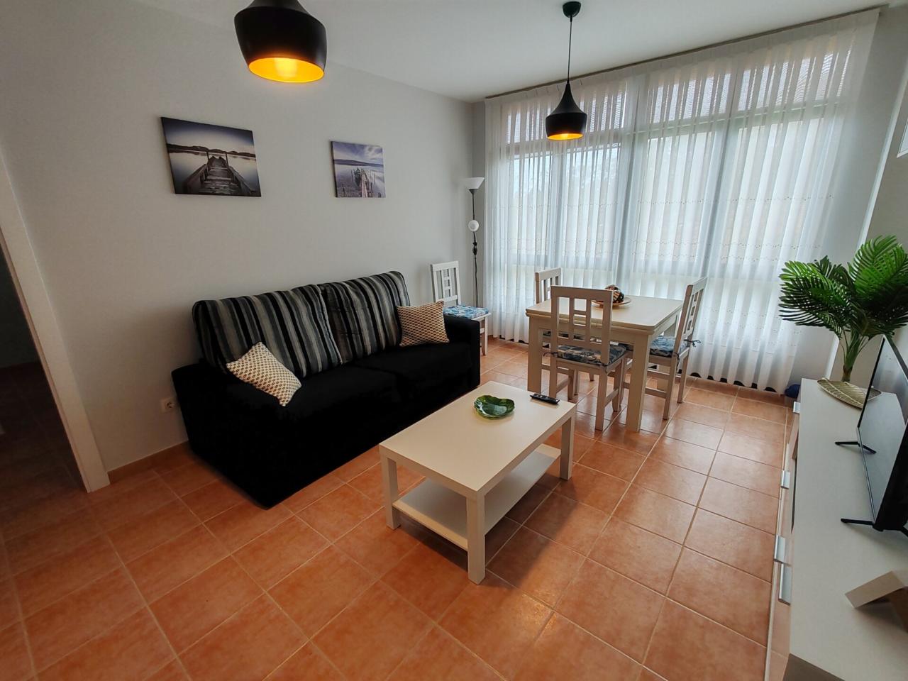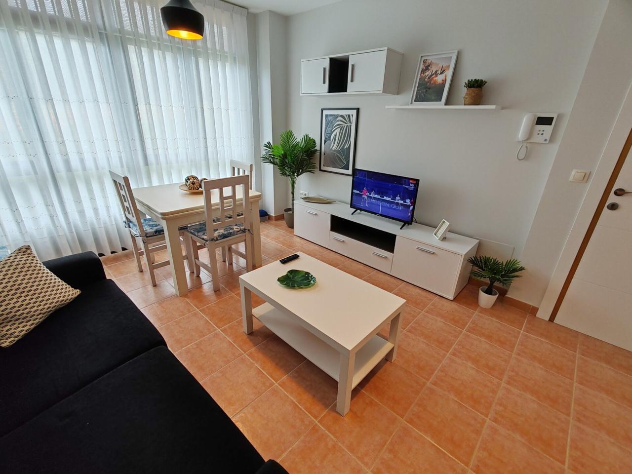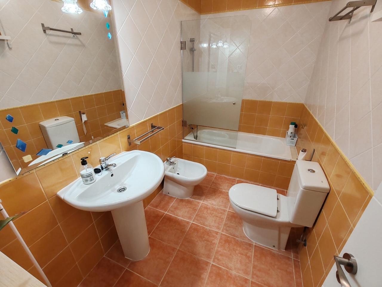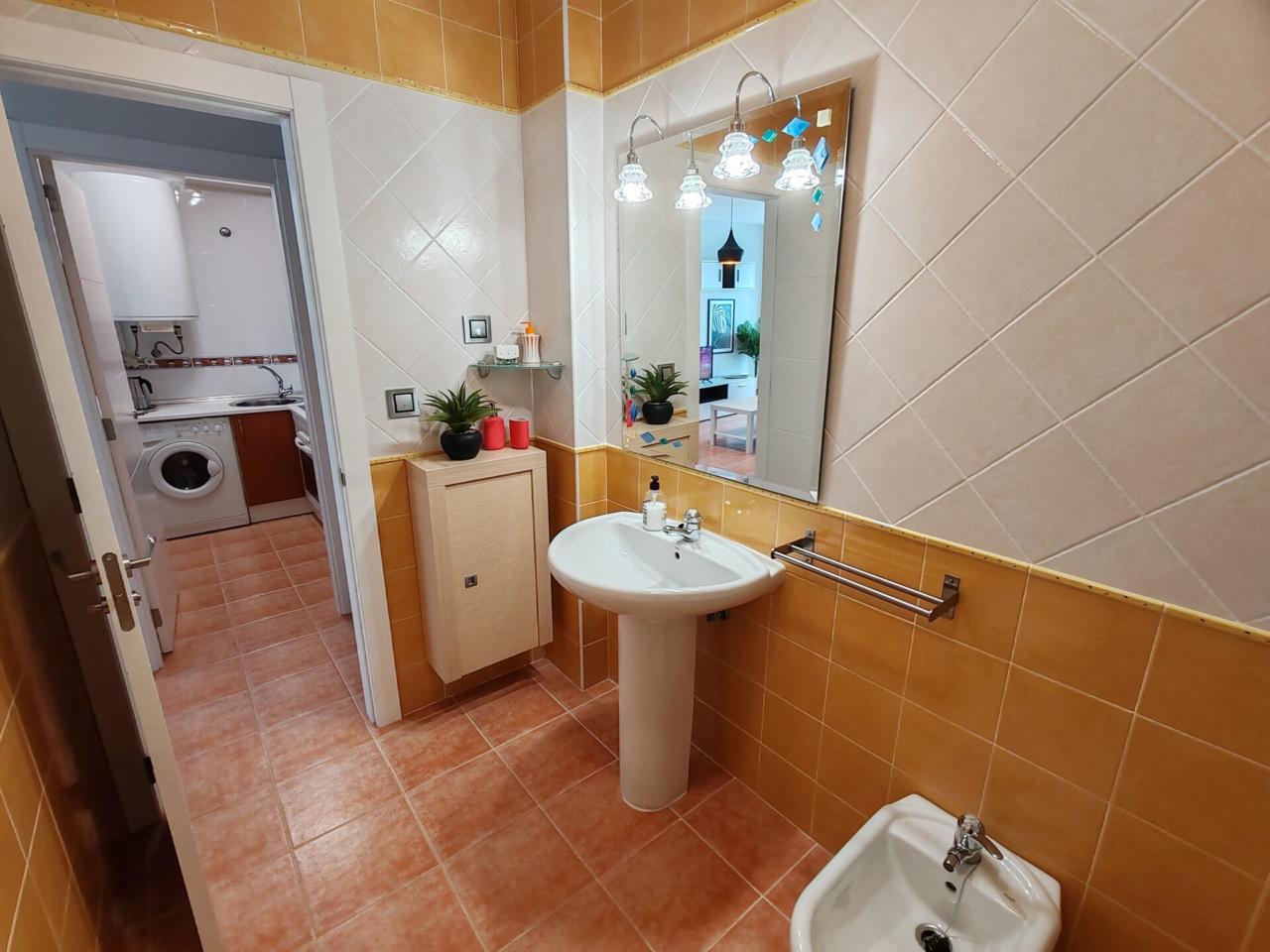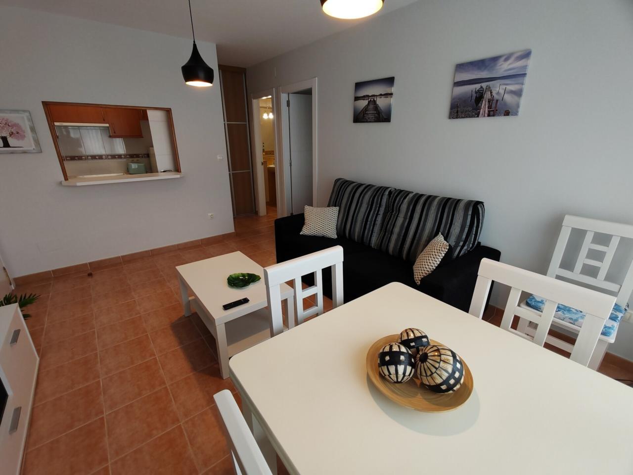 Consta de: dormitorio muy espacioso con un gran armario empotrado, baño completo con bañera, cocina totalmente equipada (frigorífico, lavadora, horno, vitrocerámica, etc) y salón comedor completamente equipado. Justo al lado de la cocina hay un amplio armario empotrado que hace las veces de despensa. Además dispone de plaza de garaje.